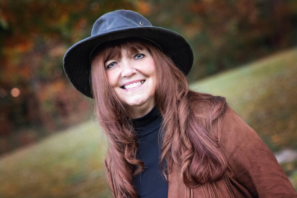 Woman smiling in sundress wearing waterproof cloth hat perfect for boating fishing or sailing